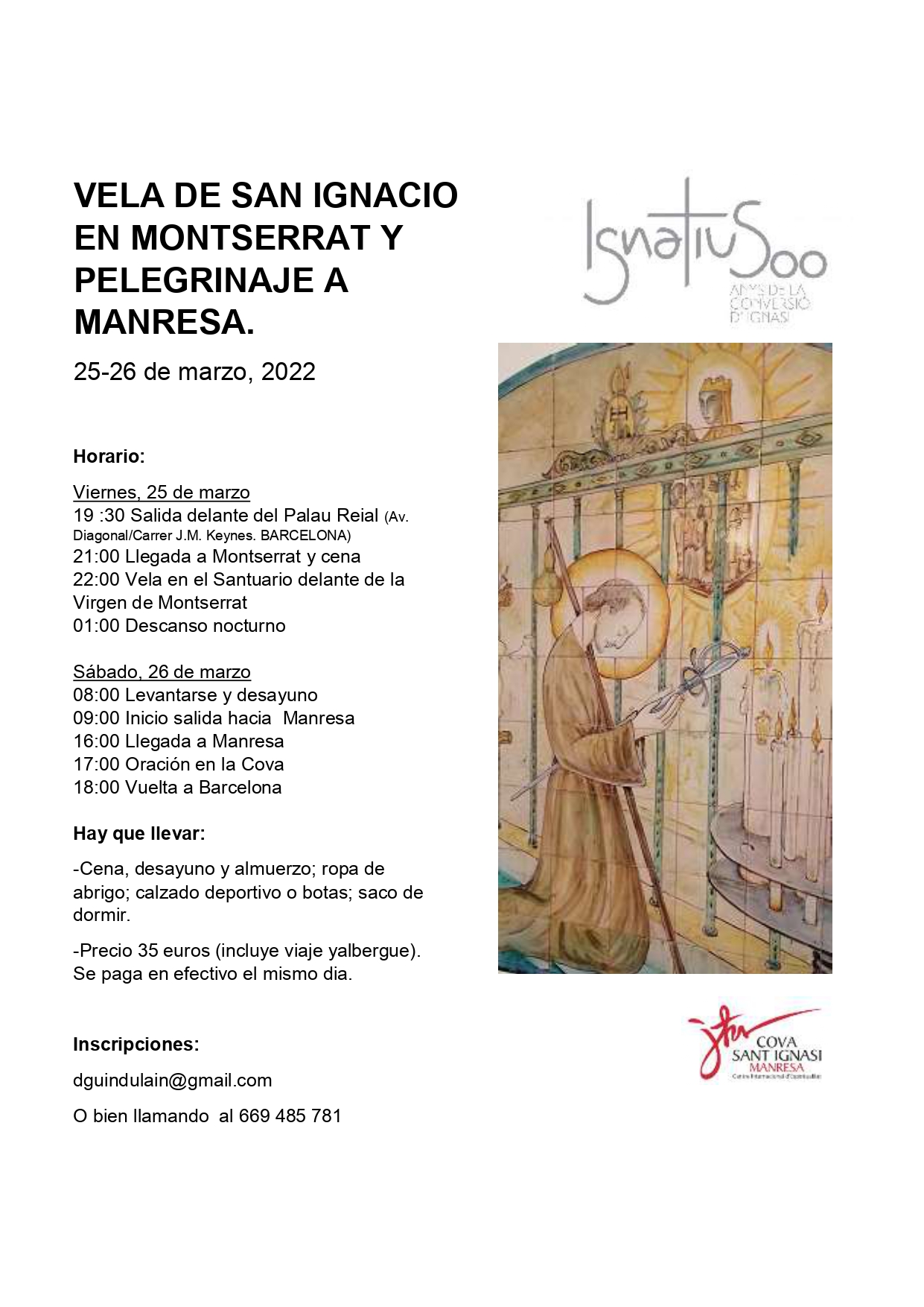 Siguiendo el ejemplo del joven Ignacio de Loyola hace 500 años, los Jesuitas de Cataluña han convocado una vela nocturna en Montserrat y una peregrinación a Manresa, rehaciendo sus pasos. Este encuentro se realiza siempre en torno al 25 de marzo, fecha en la que se conmemora la llegada de Ignacio de Loyola a la ciudad de Manresa, en el año 1522.